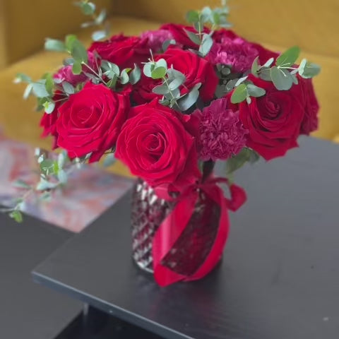 This arrangement features lush red roses, carefully arranged in a compact, rounded shape, accented with soft pink carnations for texture and tenderness. Fresh eucalyptus adds a light, airy touch, creating a beautiful balance between passion and softness. Every bloom is thoughtfully placed to highlight the natural beauty and depth of the roses.